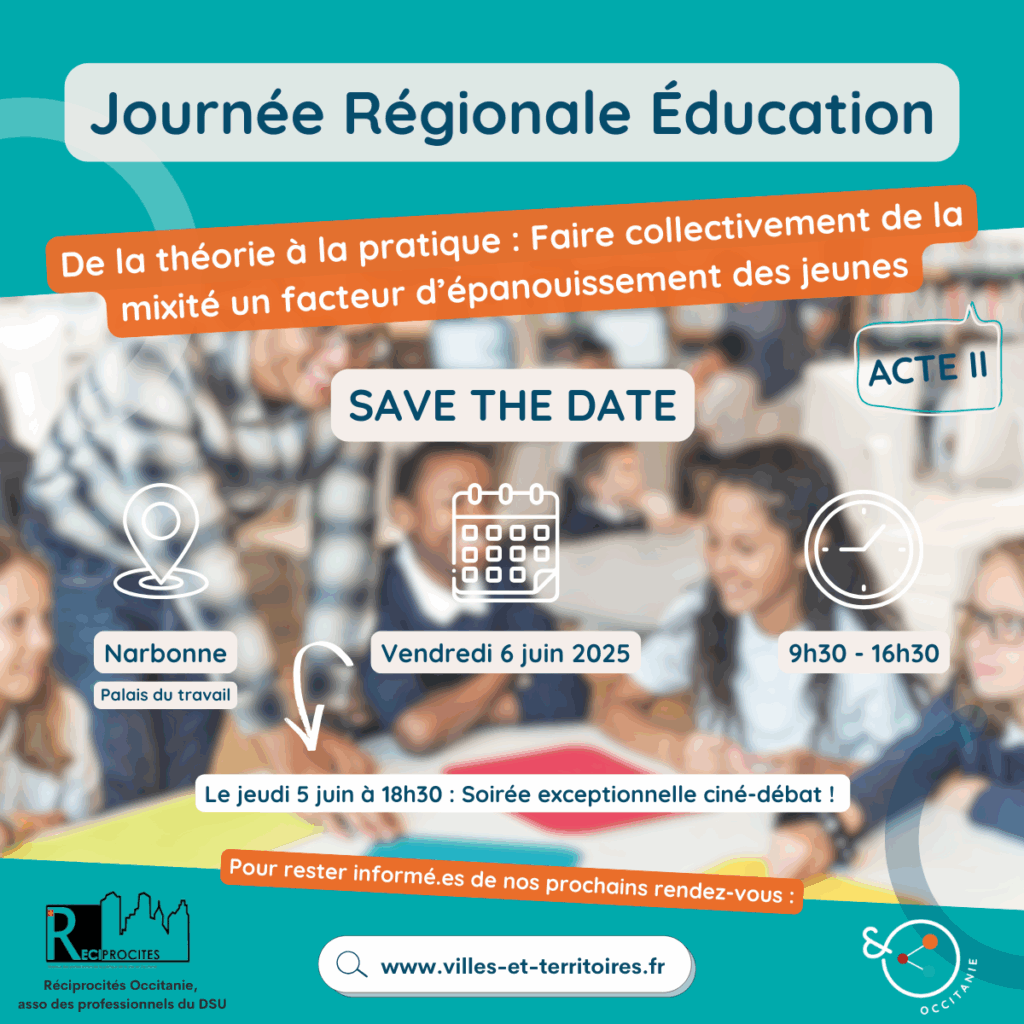 Mesdames et Messieurs, Le centre de ressources Villes et Territoires Occitanie et l’association Réciprocités Occitanie, ont le plaisir de vous inviter à la journée régionale dédiée à : La mixité en milieu scolaire, facteur de réussite ? Cette journée se tiendra à Montpellier : Vendredi 29 novembre, de 9h30 à 16h30 à l’IRTS, 1011 rue du pont de […]
