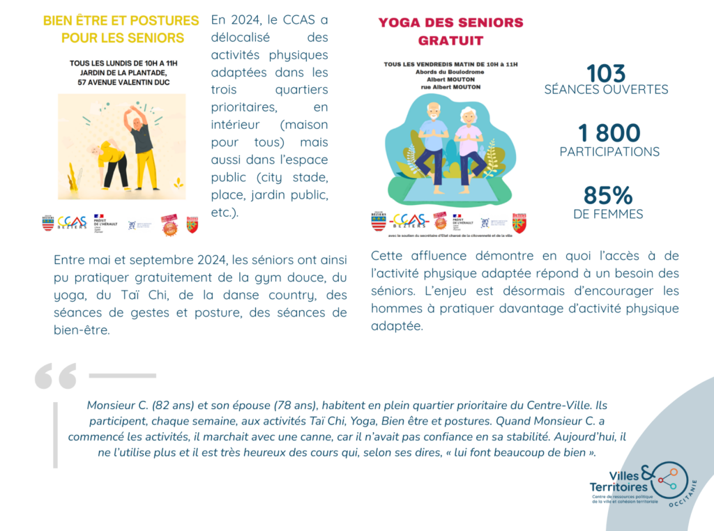 Dans une étude réaliser par notre centre de ressources sur le vieillissement de la population en QPV, nous avions constaté que la politique de la ville n’avait pas encore suffisamment pris en compte cette évolution démographique : il existait alors peu d’offre, de services, d’actions dédiées et adaptées au troisième âge. Nous avions également constaté que les CCAS, qui propose des activités accessibles aux seniors, ne se délocalisaient pas, rendant ainsi leur offre peu accessibles aux personnes âgées résidant dans les quartiers prioritaires.