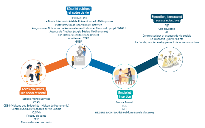 La gouvernance – Le contrat de ville est co-piloté par l’État, la Communauté d’Agglomération Béziers Méditerranée, et la Ville de Béziers. Il repose par ailleurs sur l’animation technique (maîtrise d’œuvre urbaine et sociale) de l’Agglomération par délégation du binôme « État-Collectivités »..