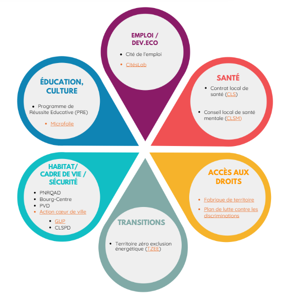 http… More, Plan de lutte contre les discriminations, Quartiers d’été, FPH, Conseil citoyens, PAQTE, VVVVille vie vacances More, GUP, GPOGroupe de partenariat opérationnel More, Cité de l’emploi, PREProgramme de réussite éducative More.