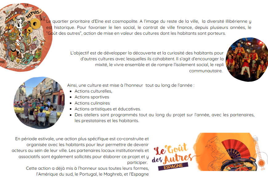 Le quartier se situé dans la commune d’Elne considérée comme la “porte d’entrée du territoire de la communauté de communes”. Il est implanté dans une commune au degré d’équipement élevé tout autant en matière de commerces que de service et qui possède un riche terroir agricole (maraîchage, arboriculture, viticulture). Cependant la ville cumule les indicateurs de précarité socio-économique (32% de chômage chez les jeunes, 30% de familles monoparentales, etc.). Par ailleurs, la ville d’Elne est engagée dans une démarche de transition écologique conséquente, impliquant ses habitants.