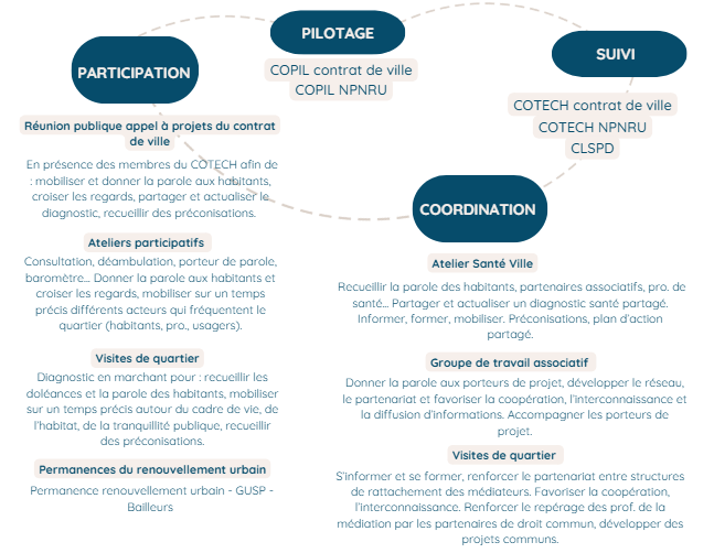 Le contrat de ville se veut le plus intégrateur et participatif. Il se structure autour de trois types d’instance : de pilotage, de suivi, de participation et de coordination